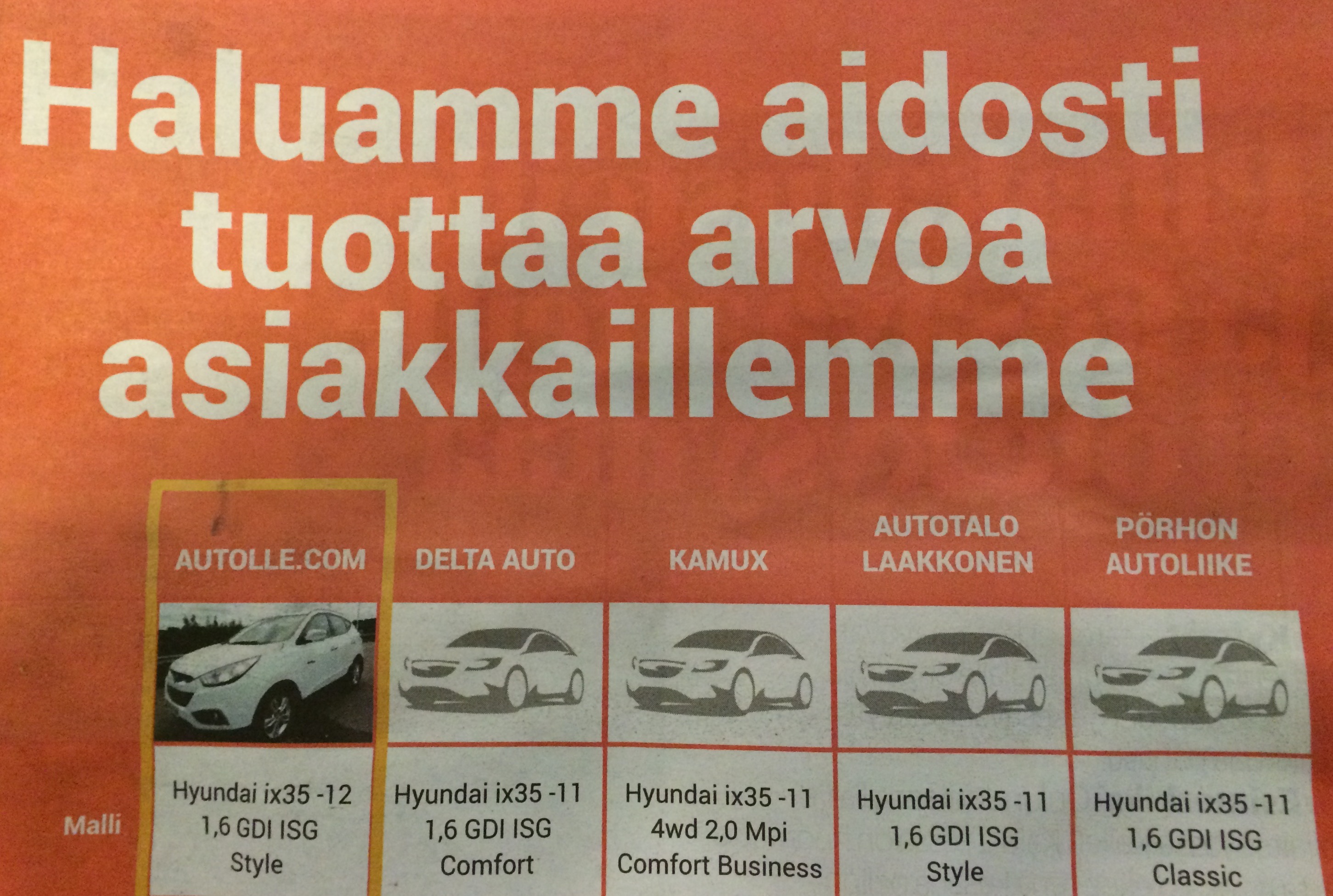 Kuvassa ollutta Autolle.comin mainosta tutkailtuani tulin siihen tulokseen, että otsikossa luvattu aito arvontuotanto minulle tarkoitti käytännössä vaihtoautolle tehtävää kuntotarkastusta. Lisäksi mainokseen valitun auton hinta oli myös silmämääräisesti edullisempi, kuin otokseen valituilla kilpailijoilla. Mutta minulle ei ainakaan ihan vielä avautunut mitä tuo aito arvontuotto nyt tarkoittaa, koska on jokseenkin helppo valita satojen autojen joukosta yksi joka on edullisempi kuin samansuuntainen malli kilpailijoilla. Auton kuntotarkastuskaan ei varsinaisesti kuulosta uniikilta jutulta (”kait nyt vaihtoautoja kauppaava tarkistaa autot?”. Siinä toki tarkastuksen tekijällä ja sisällöllä on suuri merkitys luotettavuuden kannalta.