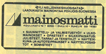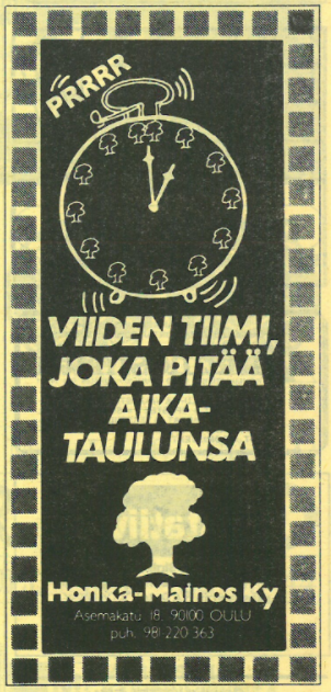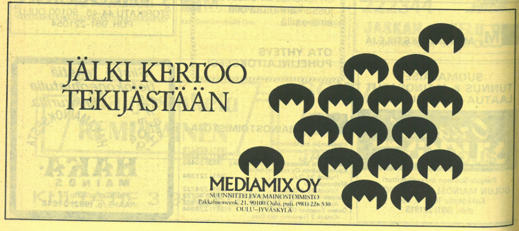 Tätä juttua varten olen saanut erittäin paljon ansiokasta aineistoa ja tarkennuksia aiempiin epätarkkuuksiin. Pakkahuoneen Petri Pitkänen paljasti myös erään kulttuuriteon: Pentti Vartiaisen mainostuotanto 1960-luvulta hänen kuolemaansa saakka on varastoituna Pakkahuoneen arkistoihin. Tämän lisäksi varmasti monella alan konkarilla on tallessa töitä eri ajoilta. Heitänpä siis haasteen ilmaan, olisiko aika järjestää oululaisen mainosalan näyttely, jossa valotettaisiin oululaista osaamista myös tällä saralla. Jos ajatus kiinnostaa tai sinulla on tähän tarkoitukseen sopivaa materiaalia tallessa, ole yhteydessä.