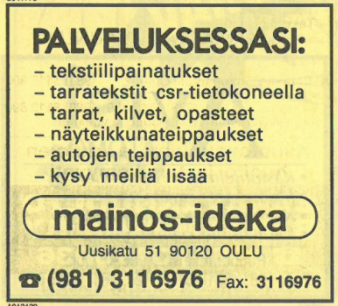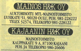 (Mainos H&K sai vauhtia, kun toimitusjohtaja Esko Kauppinen alkoi ohjata Liitto-lehden ja Oulu- Lehden ilmoituksia toimiston kautta. Todennäköisesti tiesi tulevasta erottamisesta Liitto Oy:stä.