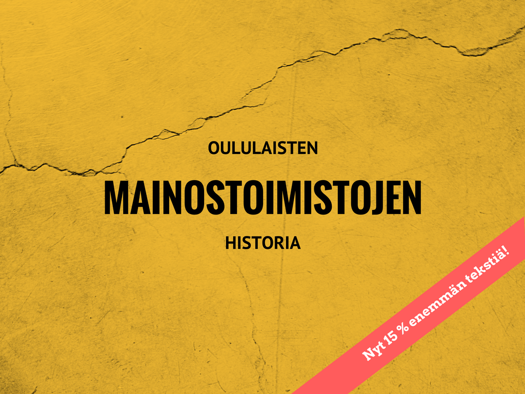 Oulun mainostoimisto -historiasta ei tietääkseni ole tätä ennen tehty yhteenvetoa. Luet siis ehkä ensimmäistä historiikkia aiheesta. Toimistot eivät olisi mitään ilman niissä työskentelevää luovaa väkeä, joten toimistojen historia on myös samalla siellä työskennelleiden henkilöiden historiaa.