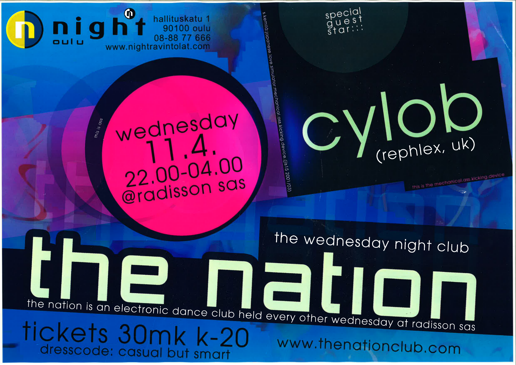 The Nation -klubi syntyi kun Oulun yökerhotaivaan uusin tähti Night avasi ovensa ja uusi ravintolapäällikkö kaipasi jotain erilaista ohjelmaa taloon. Varovaisten tiedusteluiden jälkeen homma lähti etenemään vauhdilla ja The Nation -klubi syntyi. Avajaiset järjestettiin lauantai-iltana ja pääesiintyjänä oli DMX Krew. Majoitukset ja lennot järjestyivät mukavasti SAS-yhteistyön kautta. Keskiviikon klubi-iltoja ehdittiin järjestää vajaa kymmenen ja toinen merkittävä ulkomainen stara oli Cylob. Käytännössä The Nation kuivui kasaan henkilövaihdosten myötä, kun Nightissä jatkanut ravintolapäällikkö ei ollut ehkä ihan samalla aaltopituudella iltojen idean kanssa.