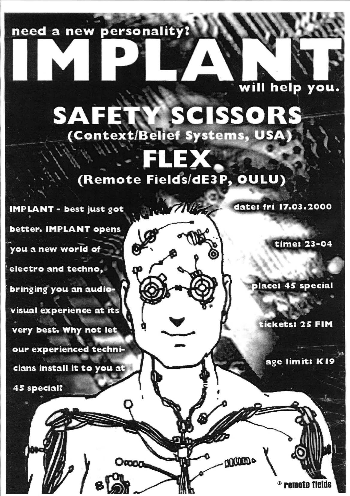 Implant (lineup) järjestettiin 45 Specialissa ja sinne saatiin pääesiintyjäksi jenkeistä Safety Scissors. Lupauksemme oli jälleen jäätävä: ”A Night of Quality Electronics”. Mies tuli junalla läpi Suomen ja kärsi aikaerosta ja väsymyksestä – keikka ei ollut parhaasta päästä, mutta tapahtuma oli itsessään hyvä. Visualisointeihin saatiin jostain nippu mallinuken päitä, joilla oli sitten kaikenlaisia implantteja päässään. Aiempien häppeninkien jälkeen tilaisuuden järjestäminen ravintolassa oli varsin helppoa ja mukavaa. Oksanen ovella piti kuria ja järjestäjät pystyivät keskittymään ajan kanssa olennaiseen.