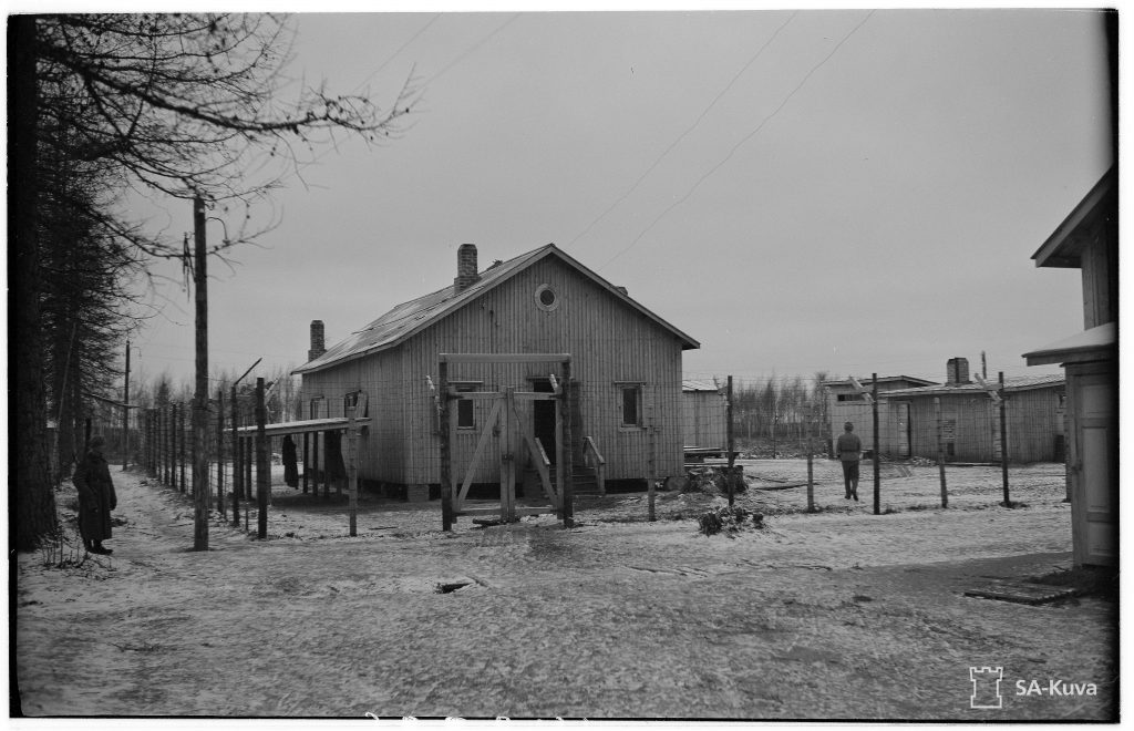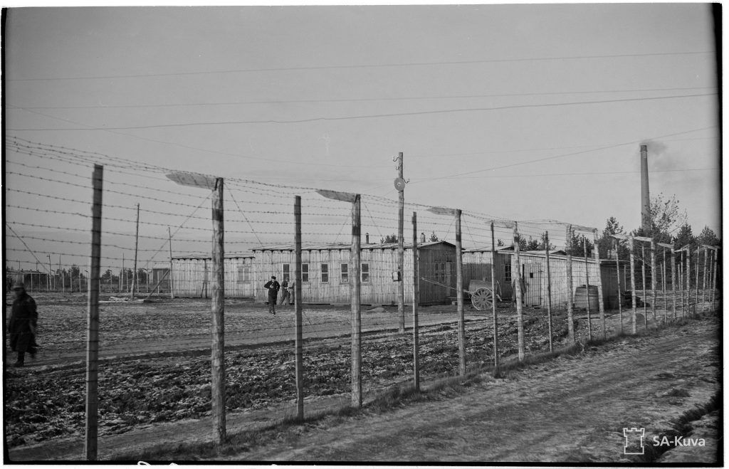 Sv-leiri N:o 19. Nuottasaaren leiri. Yleiskuva. Taustalla näkyy Oulu O/Y:n savupiippu. SA-Kuva. Pieni rakennus oikealla on sotavankien keittiö. Takana näkyy parakkirivistöä, parakkeja oli kolme rinnakkain ja lopulta yhdeksän kappaletta. Myöhemmin leirillä säilytettiin saksalaisia sotavankeja Sv. leiri 41:n nimissä.