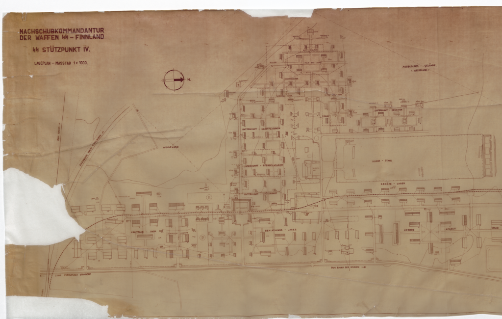 Kartta- ja piirustuskokoelma (OMA) – XV:6 Kartta Waffen SS-Finlandin huoltokomendantin virastosta 1942-1942, jakso 2: <piirroksen oikea puoli; Kansallisarkisto: https://astia.narc.fi/uusiastia/viewer/?fileId=5653918280&aineistoId=2062877768 / Viitattu 24.2.2025