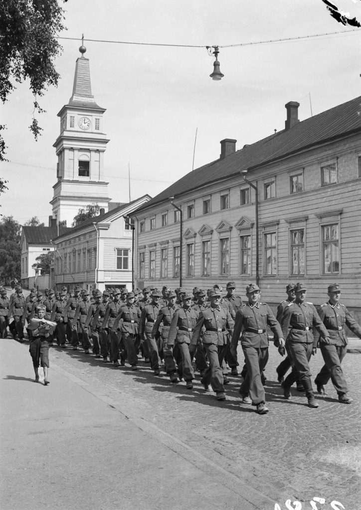 Saksalaiset marssivat Kirkkokatua pitkin. Lähde: Museovirasto – JOKA Journalistinen kuva-arkisto – Kalevan kokoelmat