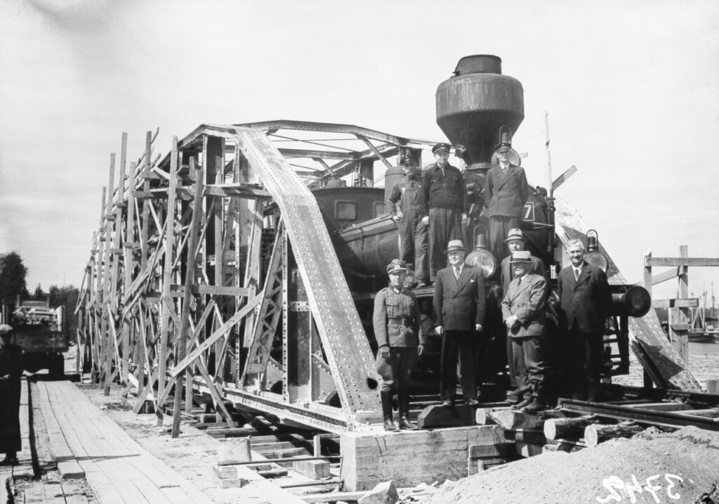 Hietasaaren pengersillan rakennustyömaa 1942. Sillan takana metsän siimeksessä Vaakunakylä. Lähde: Wikipedia / Autio, Alpo E. (1951) Merikosken voimalaitos, Oulu: Oulun Kaupunki, p. 139