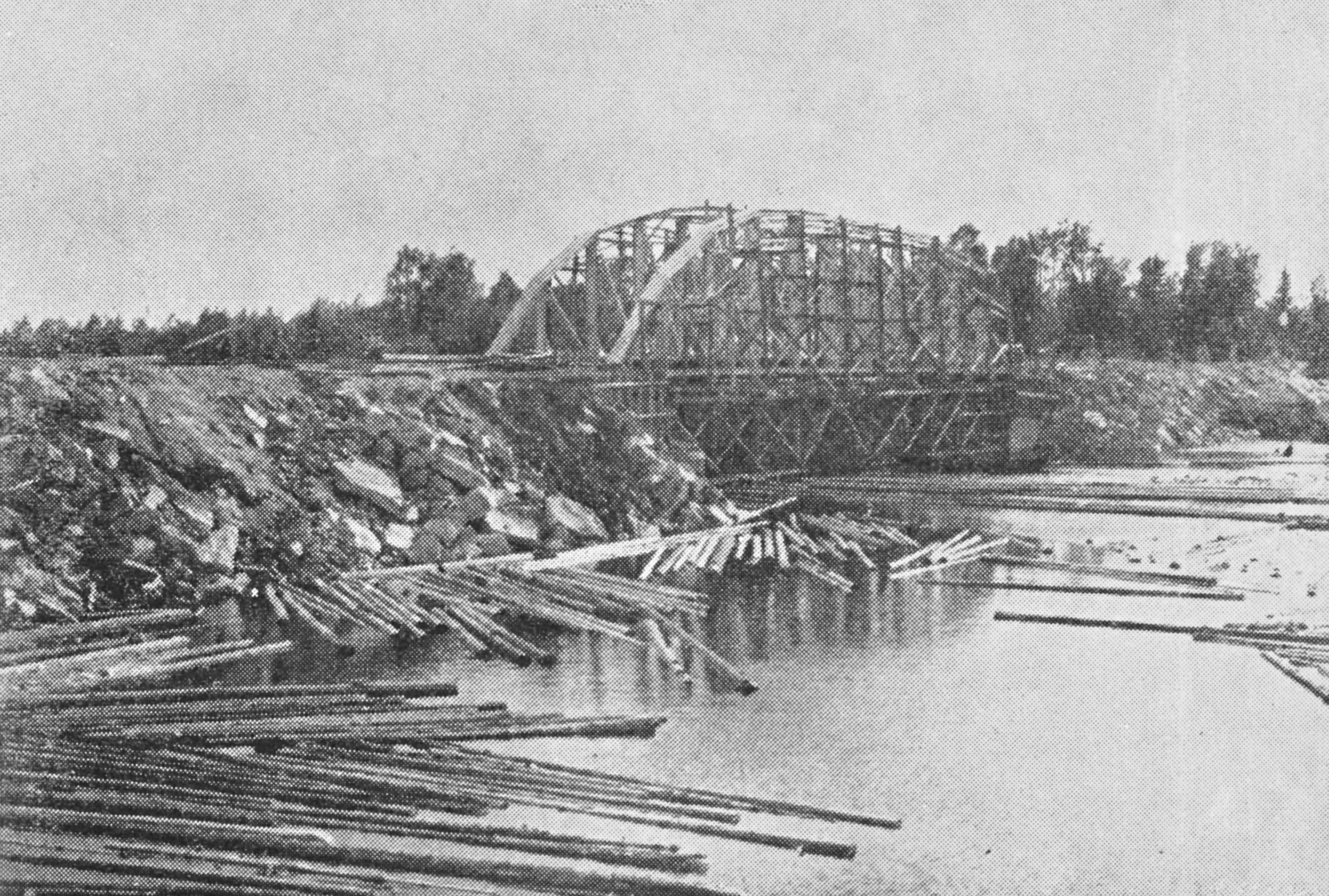 Hietasaaren pengersillan rakennustyömaa 1942. Sillan takana metsän siimeksessä Vaakunakylä. Lähde: Wikipedia / Autio, Alpo E. (1951) Merikosken voimalaitos, Oulu: Oulun Kaupunki, p. 139